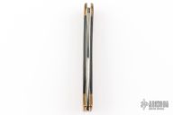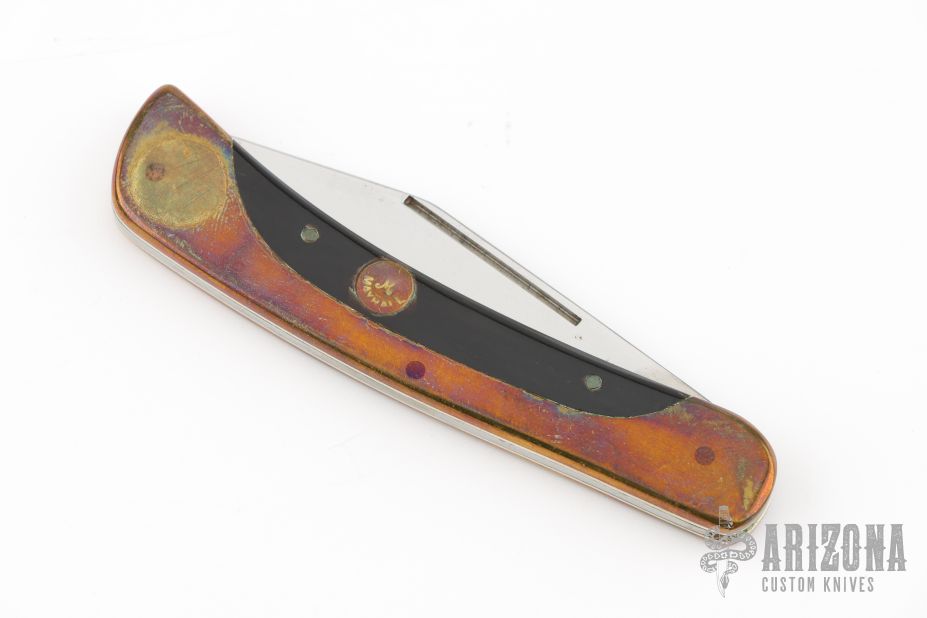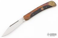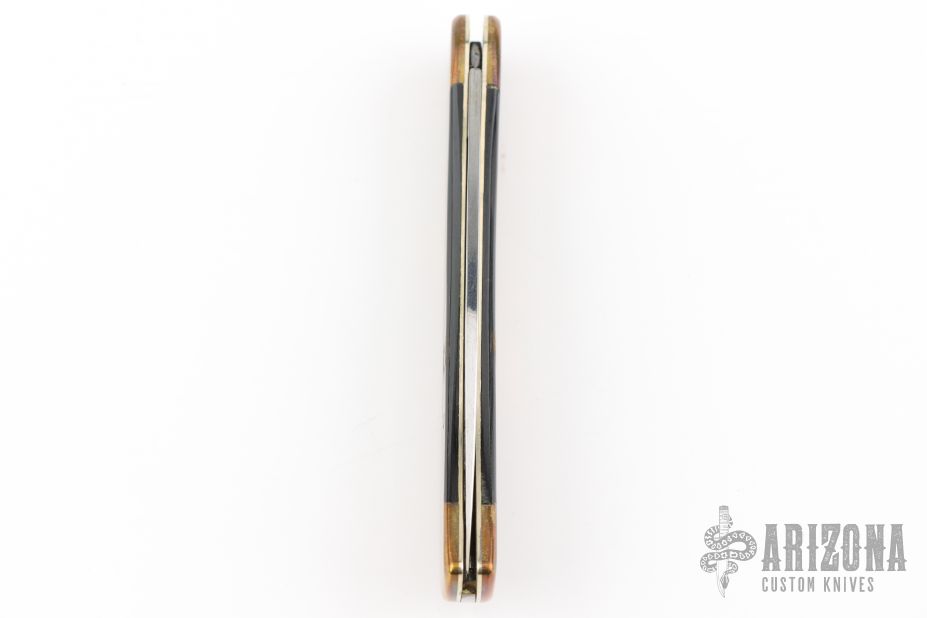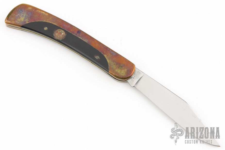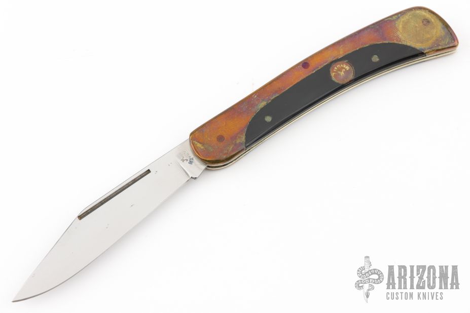 This slipjoint by AM Mayhall features a mirror polished clip point blade with long pull. The handle has nickel silver liners, brass covers with an escutcheon, wood inlay, and steel spring. Has some patina and scratches, good condition otherwise.