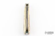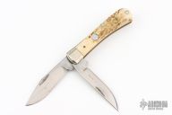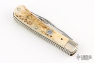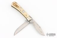 This slipjoint by AM Mayhall features mirror polished blades with nail nicks. The handle has nickel silver bolsters, stag covers with a nickel silver escutcheon, brass liners and steel springs. Has some scratches, patina, and light rust spots. Good condition otherwise. Small Blade is 2.875".