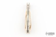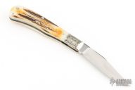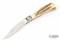 This vintage slipjoint by Tony Bose features a satin finished blade with a nail nick.  The handle has engraved nickel silver dovetailed bolsters, stag covers, nickel silver liners, stainless steel spring. Has a half stop, flush in the open and closed positions. Engraved by Bruce Christensen with images of an African Leopard. Excellent condition. Comes with a stingray skin pouch. Beautiful early example of Tony's work.