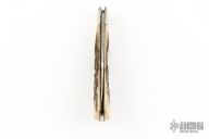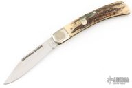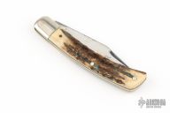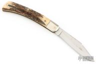 This slipjoint by AM Mayhall features a mirror polished blade with long pull. The handle has nickel silver bolsters, stag covers with an escutcheon, brass liners and steel spring. Has scratches and patina, great condition otherwise.