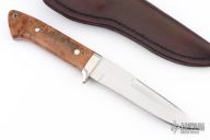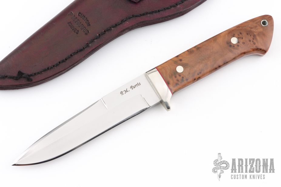 This Fighter by Phillip M Parris features a mirror polished double edged blade with .194" blade stock and 1.134" blade depth, full tapered tang construction. The handle has a nickel silver guard, burl wood scales with nickel silver pins, red spacers and red liners. Comes with a brown leather sheath. New from maker!