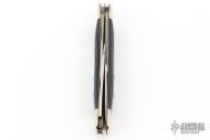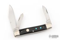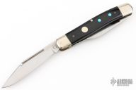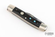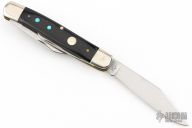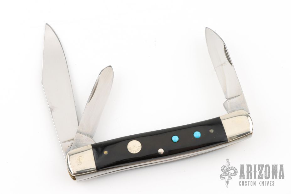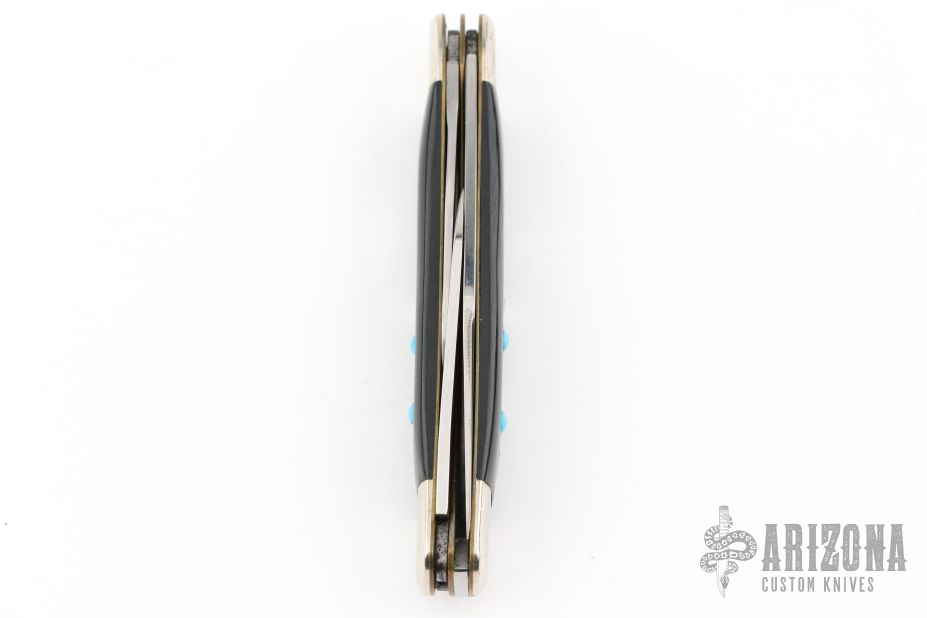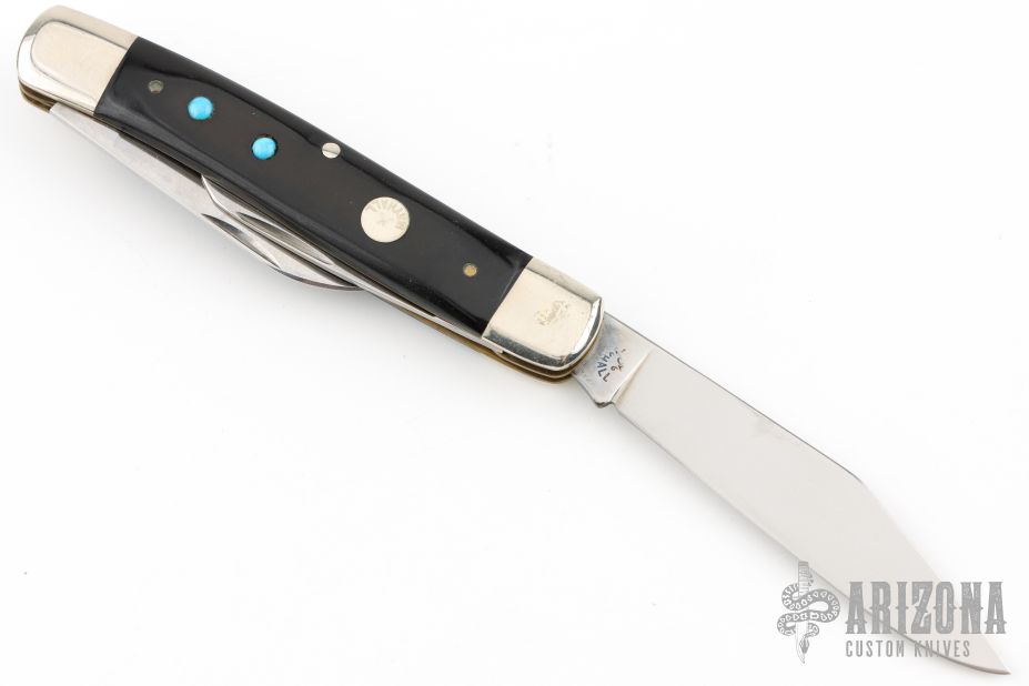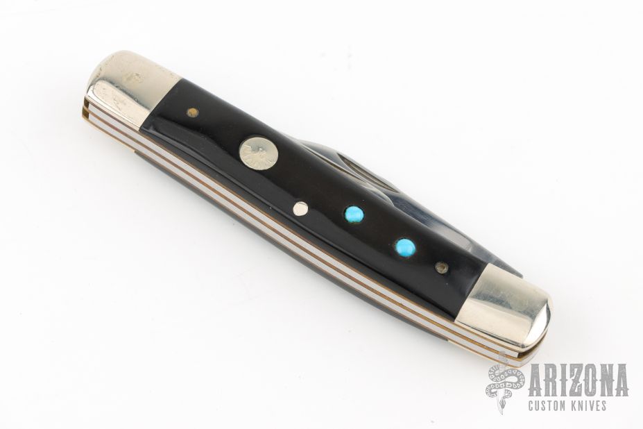 This slipjoint by AM Mayhall features mirror polished blades with nail nicks and long pull. The handle has nickel silver bolsters, buffalo horn covers with a nickel silver escutcheon, four blue insets, brass liners and steel springs. Has some scratches, patina, and light rust spots. Good condition otherwise. Small Blades are 2" and 2.125".