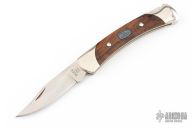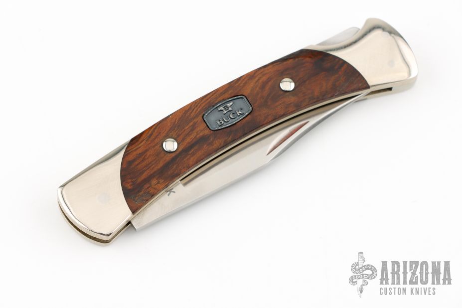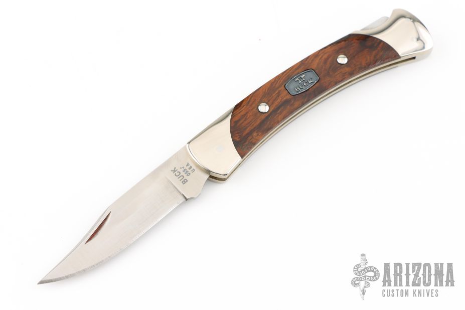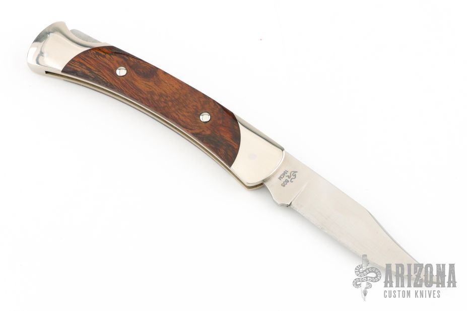 This Buck features a satin finished blade with nail nick. The handle has nickel silver bolsters with integral liners, ironwood inlays and stainless steel spring. Comes with original box and papers. Excellent condition. One of 500 Buck of the Month June 2023