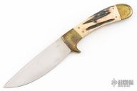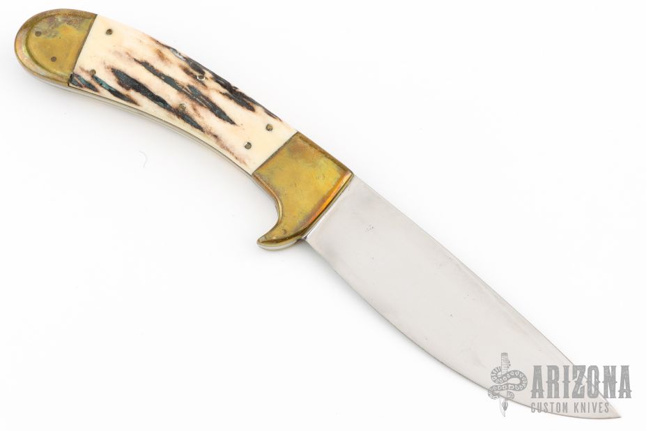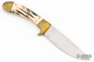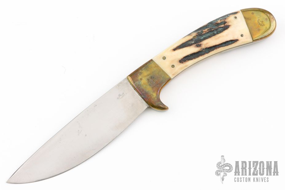This Skinner by AM Mayhall features a satin finished blade with .077" blade stock and 1.066" blade depth, full tang construction. The handle has brass front/rear bolsters, and pinned stag covers. Has scuffs, scratches and patina. Good condition otherwise.