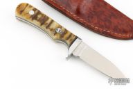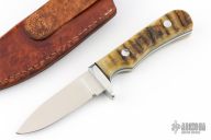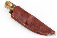 This Drop Point Hunter by Eddie White features a satin finished blade, .155" blade thickness and 1" depth, full tang construction. The handle has a stainless steel guard, sheep horn scales over black fiber liners. Includes leather sheath with belt loop. Has a couple light scratches, the scales have shrunken slightly creating a gap between the guard and scales, otherwise good condition. Numbered 048 on ricasso.