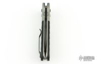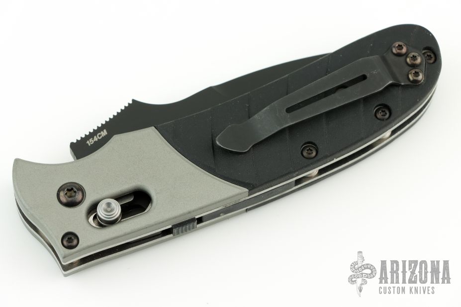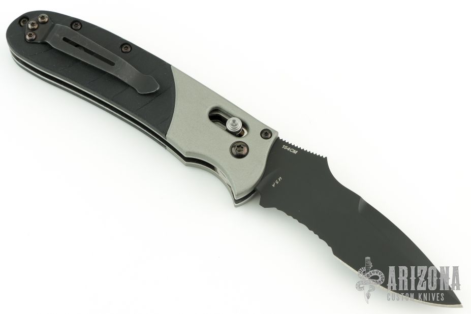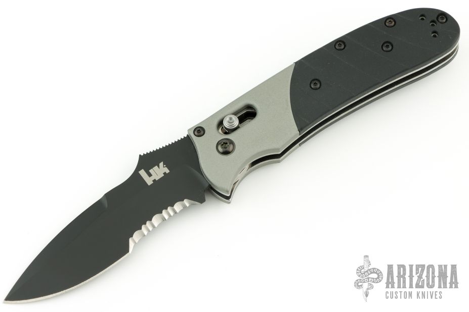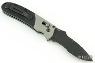 This knife by Heckler & Koch is made by Benchmade and designed by Mike Snody, it features a black serrated recurve blade with notched thumbrest and dual thumbstuds. Bead blasted aluminum bolsters with a rubberized handle for sure grip. Tip up clip, left or right reversible. Nice lockup, action and blade seating. Comes in a drawstring pouch. Has some scuffs, and light scratches otherwise excellent condition.