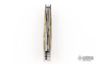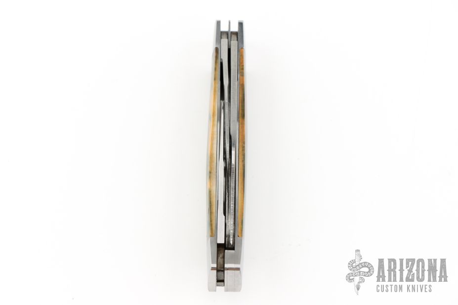 This Stockman by Frank Edwards features his own Mosaic Damascus blades with nail nicks. The handle has 416 SS bolsters with integral liners, mammoth ivory covers, stainless steel springs with half-stops, flush in all positions. The makers mark is engraved into the spine of one of the springs. Comes with a zippered case and COA. New from maker.
