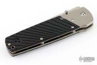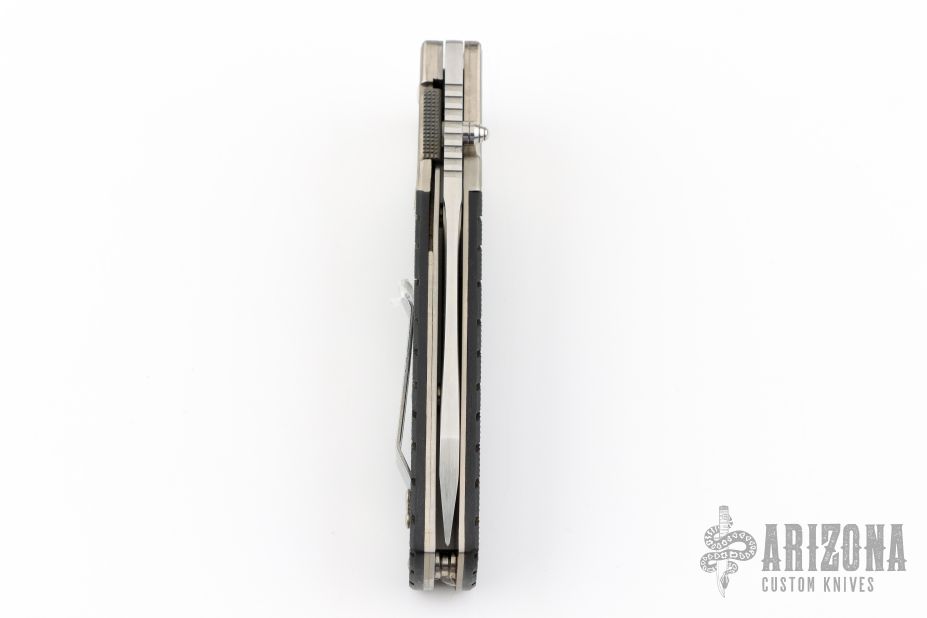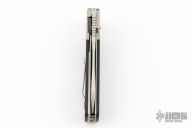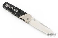 This Hatamoto linerlock by Cold Steel has a high satin finished San Mai III stainless steel tanto blade with dual thumb studs and notched thumb rest. Handle is black G10 over titanium liners and satin finished titanium bolsters. Stainless steel tip up reversible clip and lanyard hole. New condition. Comes with original box and aluminum case. Still has the protective covers on the bolsters.
