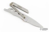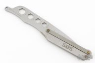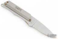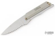 This vintage SOS from Benchmark Knives features a bead blast finished drop point serrated blade with notched thumbrest, 1/8" blade stock and 1" blade depth. The handle has hex wrench openings, 11/32, 3/8, 7/16, and 1/2. Has some scuffs, scratches, and rusting. Good condition otherwise.