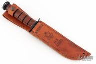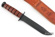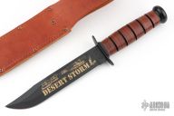 This KA-BAR fighting knife was part of a limited run done for Desert Storm. The black coated clip point blade with swedge and fullers features commemorative artwork of "Desert Storm". The handle is comprised of a black coated steel guard and pommel with stacked leather handle over hidden tang construction.Comes with original box and sheath. Excellent condition.