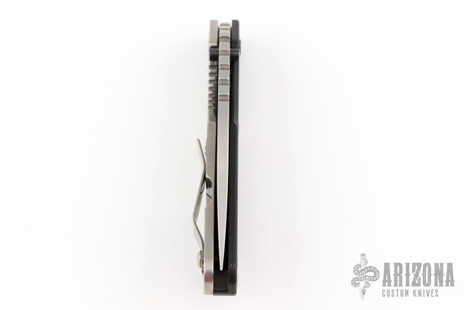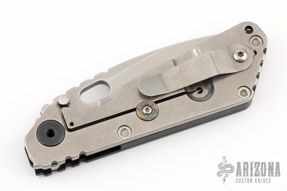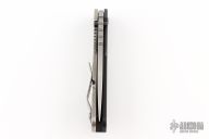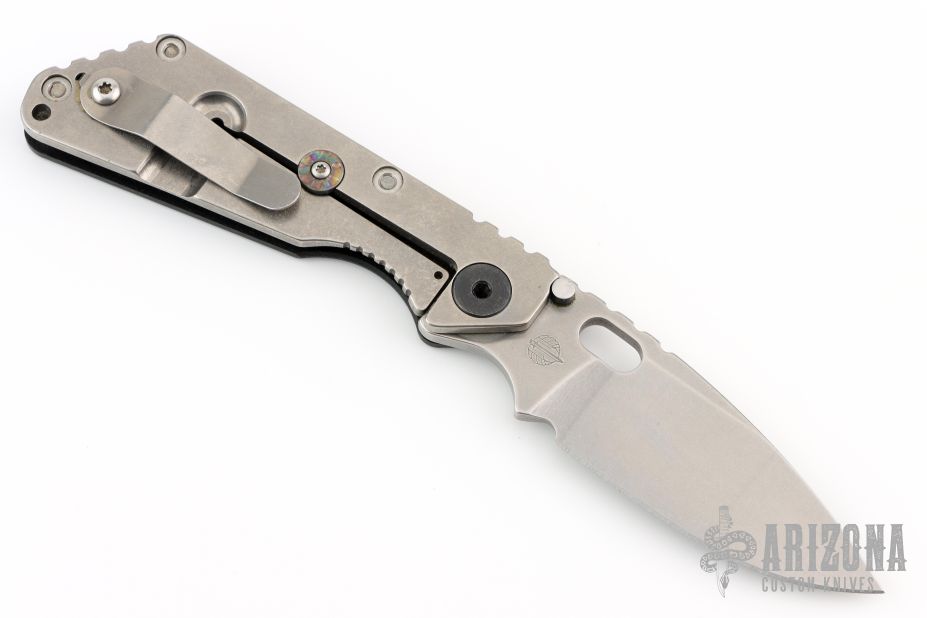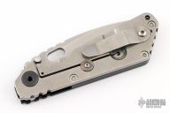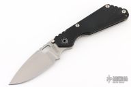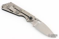 This Strider SNG framelock folder features a stonewashed blade with thumbhole and notched thumbrest. The handle has a black G-10 and stonewashed titanium frame with titanium clip, tip up carry. Jimping on blade spine. Nice lockup, detent, and blade seating. Has scuffs and scratches throughout, good user condition.