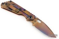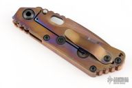 This Mick Strider SNG framelock folder features a heat color finished spear point blade with thumbhole and notched thumbrest. The handle has a copper and orange peel finished anodized titanium frame with titanium clip, tip up carry. Jimping on blade spine. Includes Hinderer "Lock Bar Stabilizer" for maximum reverse lock retention. Nice detent, lockup and blade seating. Has a couple light scuffs on the frame, and a slight patina on the copper. Excellent condition.