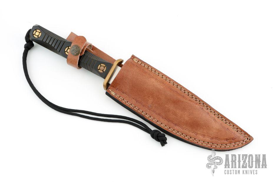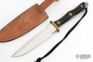 The M5 is one of EKs most popular models with polished clip point blade with false top edge. The handle is black linen micarta with brass "X" head pins. Brass double guard Full tang construction with thickness of .185" and depth of 1.263". Has a couple light scratches, and an oxidation spot, otherwise good condition. Comes with a brown leather sheath, not original to the knife. The blade has been polished and the makers mark is no longer visible.