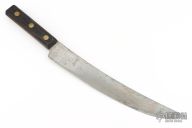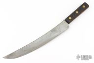 This Foster Bros Knife is made of carbon steel and has .113" blade stock and 1.664" blade depth, full tang construction. The handle has wood scales with brass pins. Has some scratches and oxidation, good condition for its age. Rare version with logo on the blade and chamfered/textured grip.