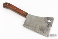 This vintage cleaver by Foster Bros features a large blade with the traditional hole at the tip, visible temper line, .213" blade stock and 5" blade depth, full tang construction. The handle has wood scales. Has some oxidation and patina, otherwise good condition for its age.