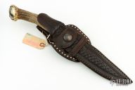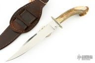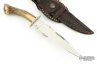 This "Butcher" Bowie by Don Norris features an antiqued Dendritic 440C clip point blade with false top edge and fileworked spine, .260" blade stock and 1.368" blade depth, hidden tang construction. The handle has a nickel silver guard and a crown stag grip with a 1881 Morgan Silver Dollar coin in the butt. Comes with a beautiful hand tooled brown leather sheath made by Old Pueblo Leather. Excellent condition.