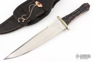 This bowie by Don Morris features a satin finished blade with false top edge, .256" blade stock and 1.746" blade depth, full tapered tang construction. The handle has a nickel silver guard and beautiful red sambar stag scales. Comes with a hand tooled black leather sheath with sterling silver concha by Old Pueblo Leather. Excellent condition.
