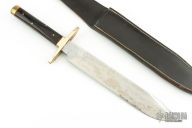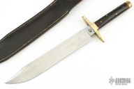 This bowie by Jonathan Crookes features a satin finished blade with false top edge, .290" blade stock and 1.407" blade depth, full tang construction. The handle has a brass guard and rear bolsters, dark wood scales with red liners and brass pins. Comes with a brown leather sheath. Has some scratches, pitting and patina on the blade, otherwise good condition.
