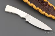 This Integral Hunter by George Hale features a mirror finished blade with .166" blade stock and 1.136" blade depth, full tapered tang construction. The handle has integral bolsters and walrus ivory scales. Comes with a brown leather sheath with "HALE" on the back, crocodile skin overlay. Excellent condition.