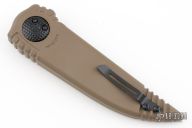 This Phoenix model sports a coyote handle with a phoenix laser etching and a CPM-S30V steel blade with a black cerakote finish. The top edge of the knife has been sharpened.
