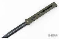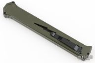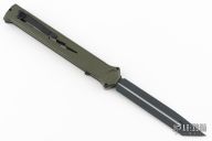 Joining the Estiletto OTF lineup is this fantastic model with a USA cutout on the green anodized aluminum body with black hardware/clip and a black coated dagger blade with sharpened top edge.