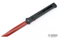Joining the Estiletto OTF lineup is this fantastic model with a USA cutout on the black anodized aluminum body with black hardware/clip and a red coated tanto blade with sharpened top edge.