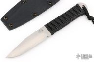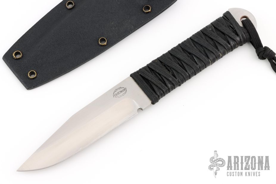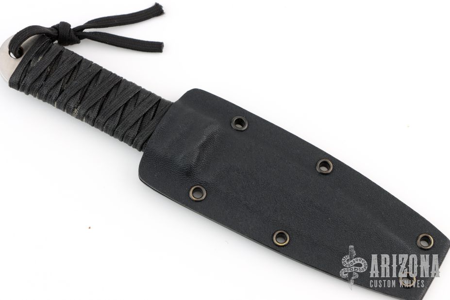 This boot knife by Al Polkowski has a satin finished blade with an epoxied black paracord wrapped handle, .133" blade thickness and 1.003" blade depth. Full tang construction. Great look and feel. Comes with a kydex sheath. Has some light scratches, otherwise good condition.