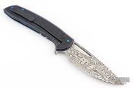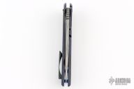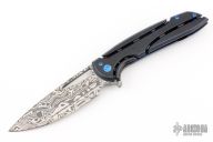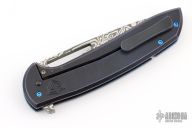 This Stinger XL by Ferrum Forge features a Damasteel blade with flipper and a thumb hole. The handle has an anodized and tumble finished titanium frame with anodized titanium hardware and tip up clip. Has caged bearings, Hoback rolling detent and a stainless lock insert. Nice detent, lockup and blade seating. Includes original zipper case, maker's card, and dog tag. Has a couple light scuffs, otherwise Excellent Condition.