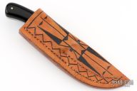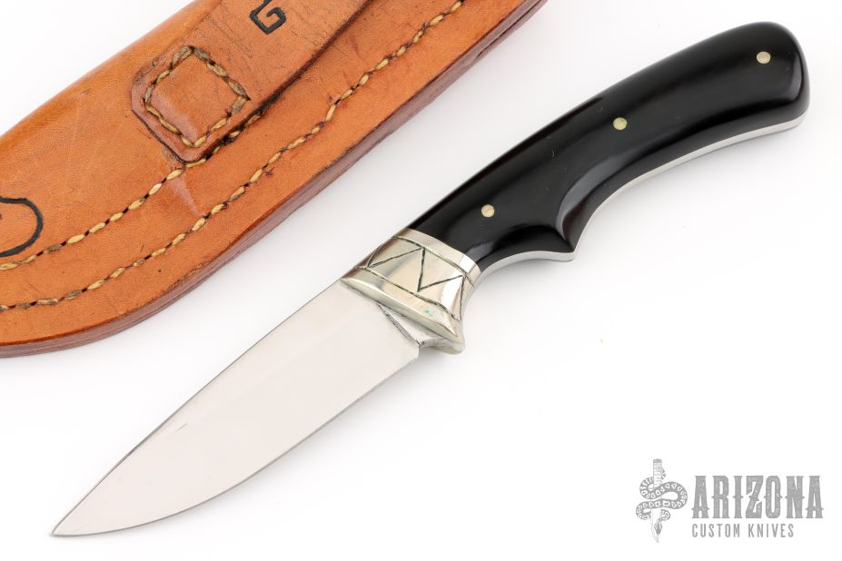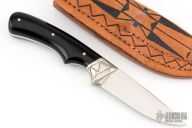 This knife by Charles Vroom features a mirror finished blade with .156" blade stock and 1.051" blade depth, full tang construction. The handle has fileworked nickel silver bolsters with black paper micarta scales and nickel silver pins. Comes with a hand tooled brown leather sheath. Has some scratches. New from maker.