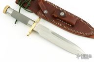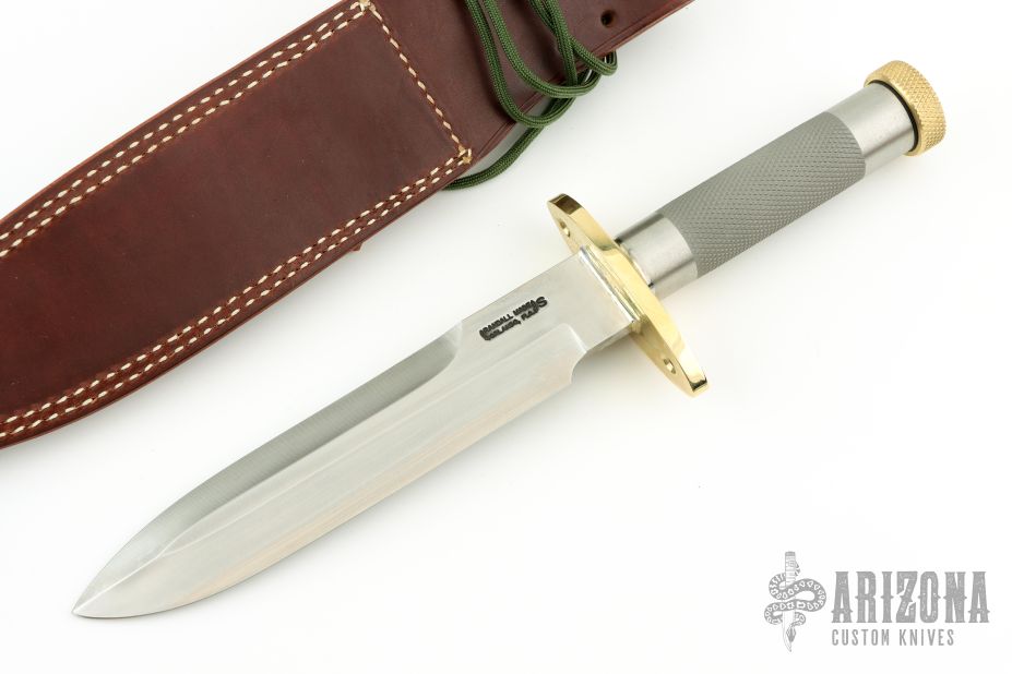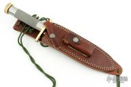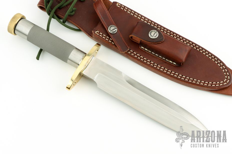 This Model 18-7.5 Attack Survival from Randall Made Knives has a spear point blade with a sharpened top edge, .240" blade stock and 1.422" blade depth, hidden tang construction. The handle has a brass guard and knurled and butt cap, smooth stainless steel handle. Comes with a brown leather sheath and original paper wrapping. Excellent condition.