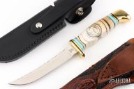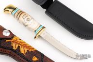 This Buck 118 custom by Buck Knives features a satin finished file-worked blade with .122" blade stock and .692" blade depth, hidden tang construction. The handle has a brass guard and butt, mammoth ivory grip, with brass spacers and turquoise spacers. Includes original Buck black leather sheath, a Buck knives box, papers, and custom hand-tooled leather sheath. Excellent condition.