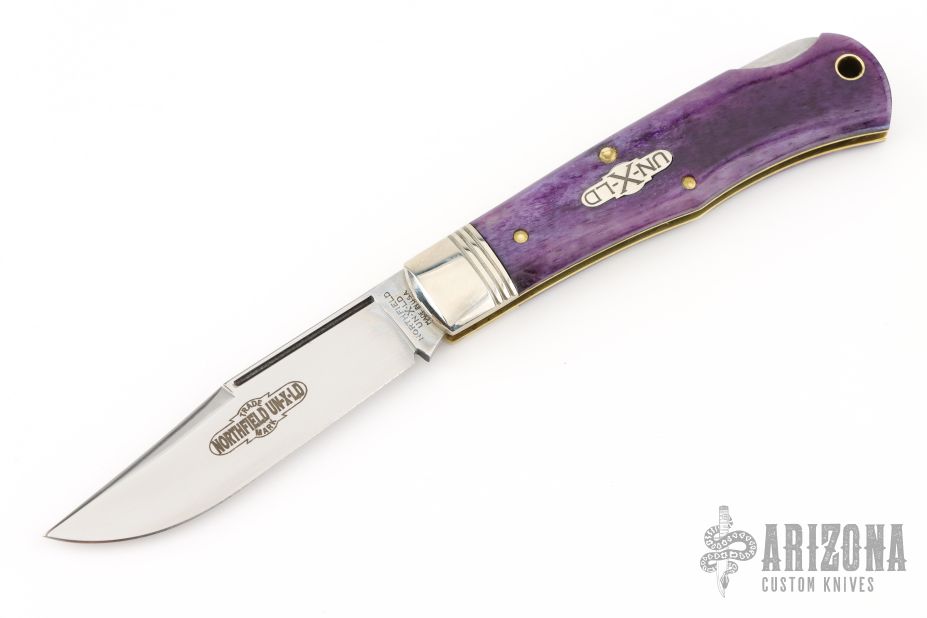 This Trapper by Northfield Knives features a mirror polished blade with nail nick. The handle has nickel silver pinched and fluted bolsters, Violet Pioneer bone covers with a nickel silver escutcheon, brass liners/pins, steel backspacer. Comes with original tube. Excellent condition. 228 Made