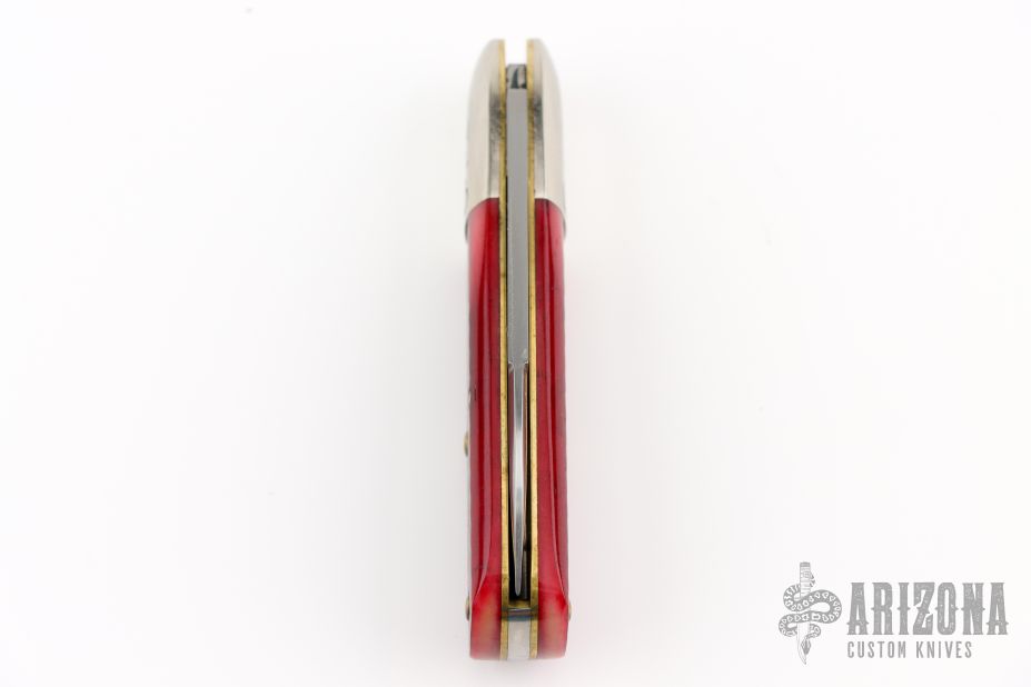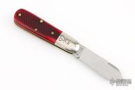 This Little Jack slipjoint by Great Eastern Cutlery features a satin finished blade with nail nick. The handle has nickel silver bolsters, blood red saw cut bone covers, brass liners and a steel spring. Has half-stop. Includes original tube. Excellent condition. 150 were made