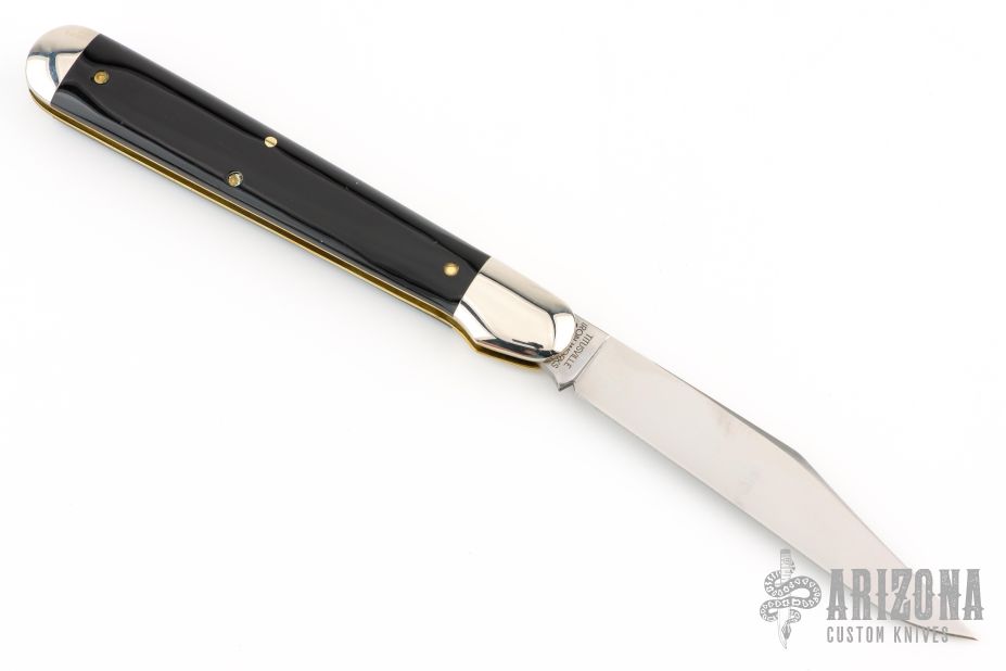This knife by Great Eastern Cutlery features a satin-finished blade with nail nick. The handle has nickel silver bolsters, brass liners, "Texas Tea" covers. Has half-stop. Comes with original tube. Excellent condition. 24 made with no serial numbers