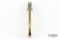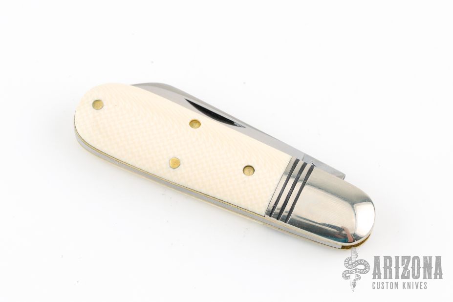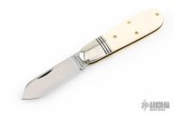 This Little Jack slipjoint by Great Eastern Cutlery features a satin finished blade with nail nick. The handle has nickel silver bolsters, unicorn ivory acrylic covers, brass liners and a steel spring. Has half-stop. Includes original tube. Excellent condition. 198 were made. This one is a Factory Second notified by the "S" on the blade.