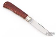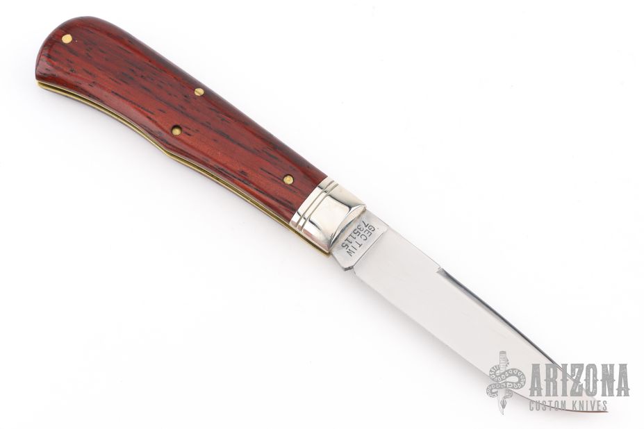 This knife by Great Eastern Cutlery features a polish finished blade with long pull. The handle has nickel silver bolsters that are pinched and fluted, nickel silver escutcheon, brass liners/pins, cocobolo covers. Has half-stop. Comes with original tube. Excellent condition.
