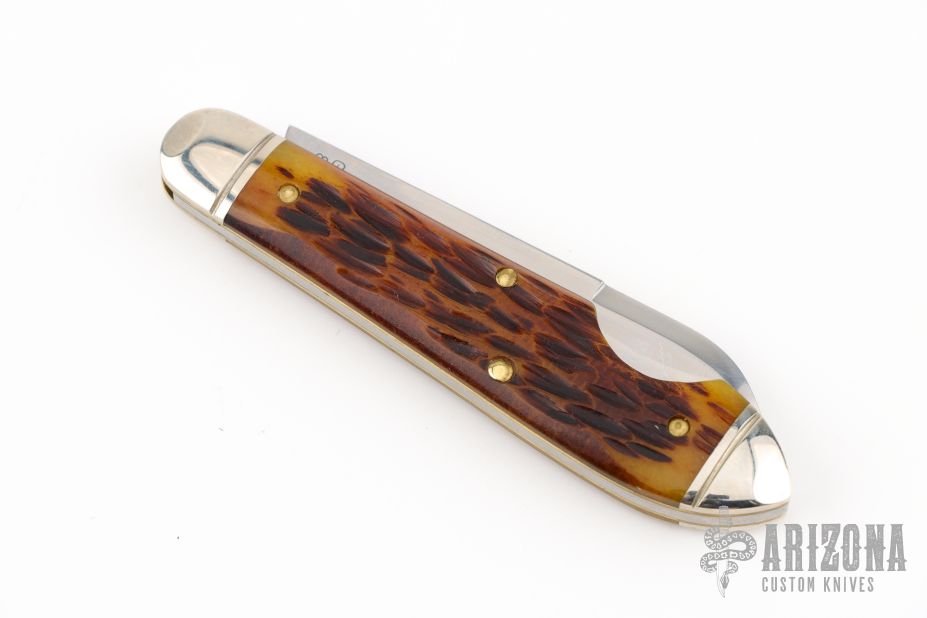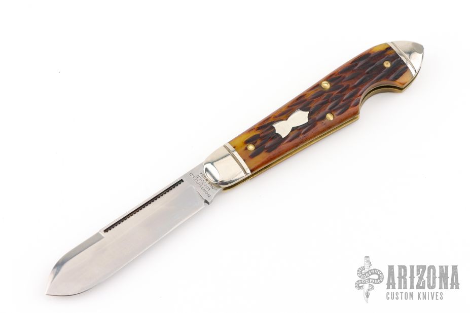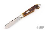 This knife by Great Eastern Cutlery features a satin finished blade with nail nick. The handle has pinched and threaded nickel silver bolsters and brass liners, antique yellow jigged bone covers. Comes with original packaging. Excellent condition. 47 were made