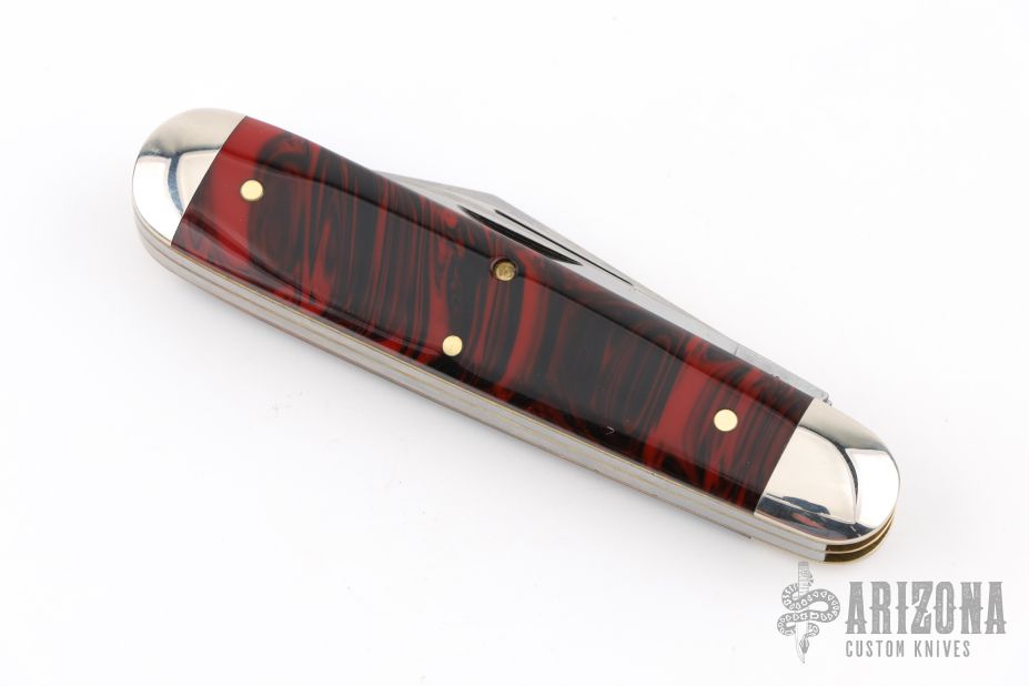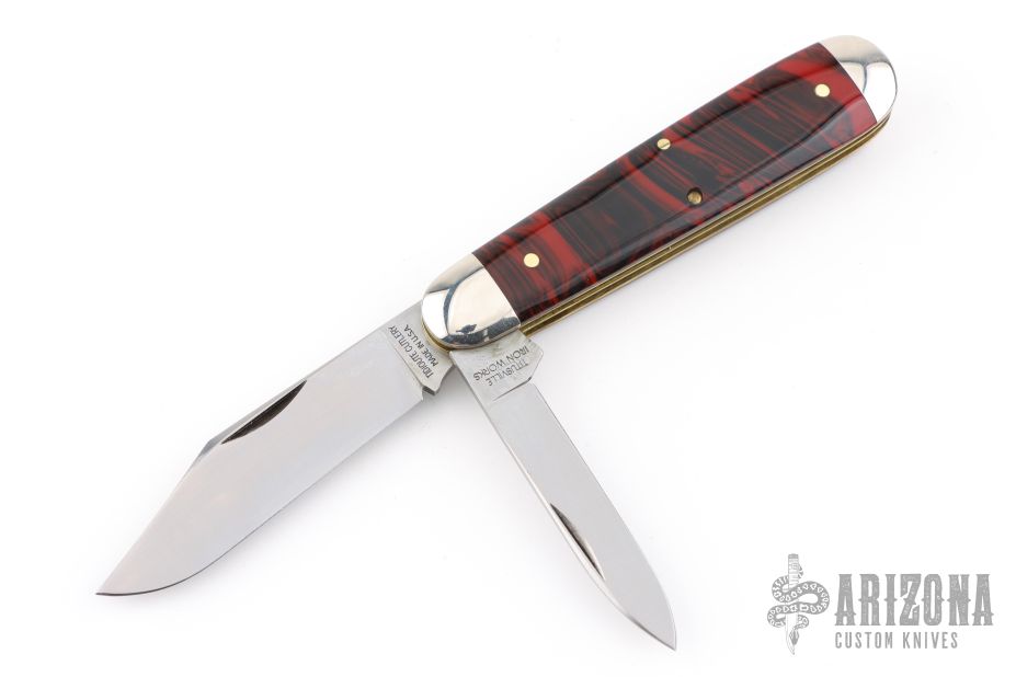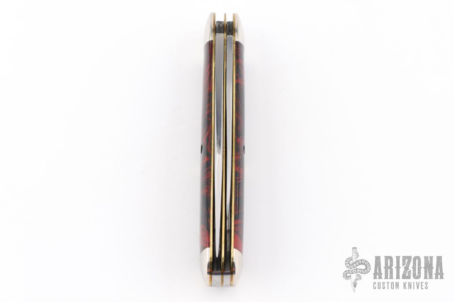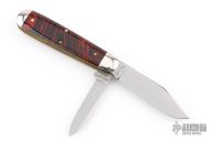This slipjoint from Northfield features satin finished drop point blades with nail nicks. The handle has nickel silver bolsters, Red River Acrylic covers with brass liners, and steel spring. Has half-stops. Includes original packaging. Excellent condition. 25 were made