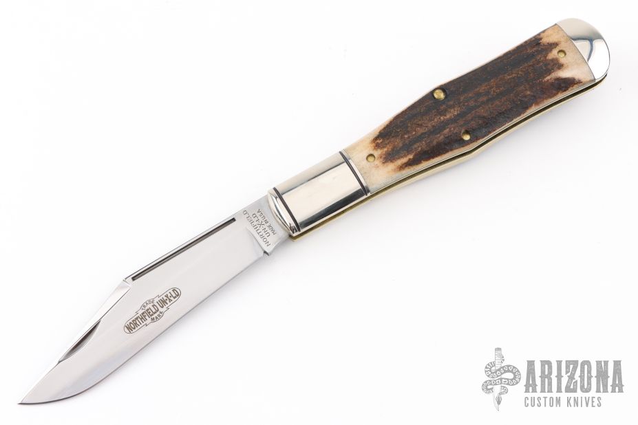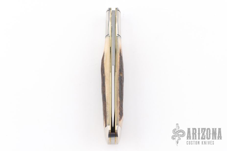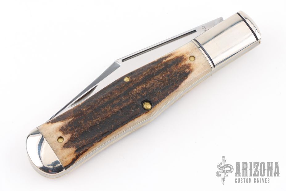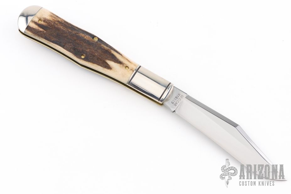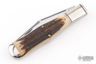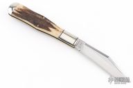 This slipjoint by Great Eastern Cutlery features a polished clip point blade with a nail nick.  The handle has nickel silver bolsters, sambar stag covers, brass liners and steel spring. Has half-stop. Includes original knife tube. Excellent Condition.