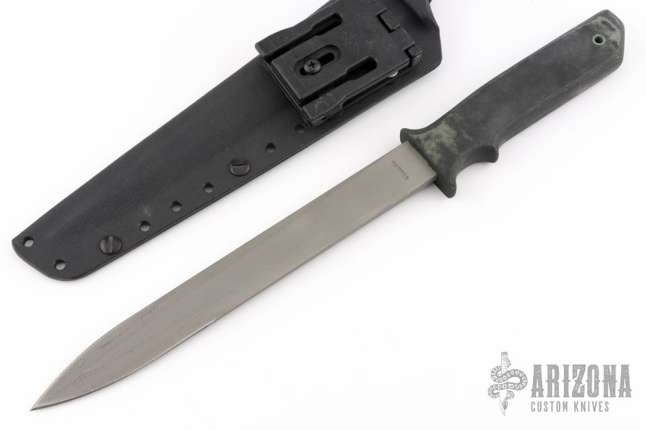 This Norwegian Seal Team Mine Probe, Circa 2001, by Strider features a double edged bead blasted blade with .249" blade stock and .999" blade depth, hidden tang construction with a black G-10 grip, lanyard hole at the butt. Comes with a kydex sheath. Has some light scuffs and scratches, great condition otherwise.