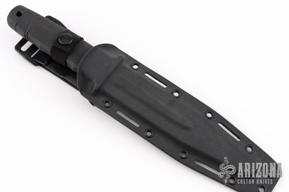 This Seal 2000 Fighter by SOG Knives has a grey coated partially serrated clip point blade with hidden tang, .236" blade stock and 1.378" blade depth. Handle is contoured glass reinforced nylon with lanyard hole. Comes with original nylon belt sheath. Has a couple light scuffs, Excellent condition.