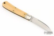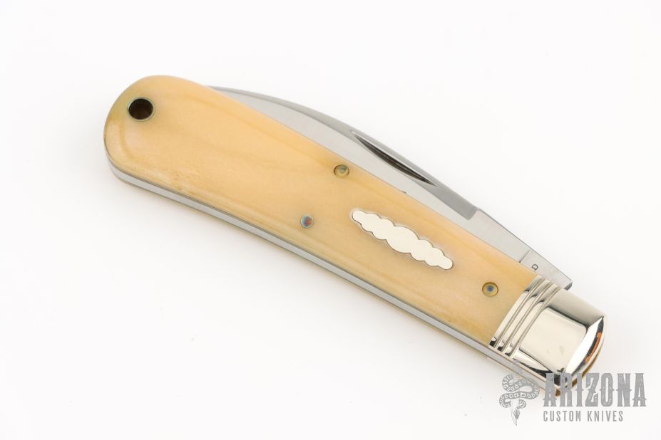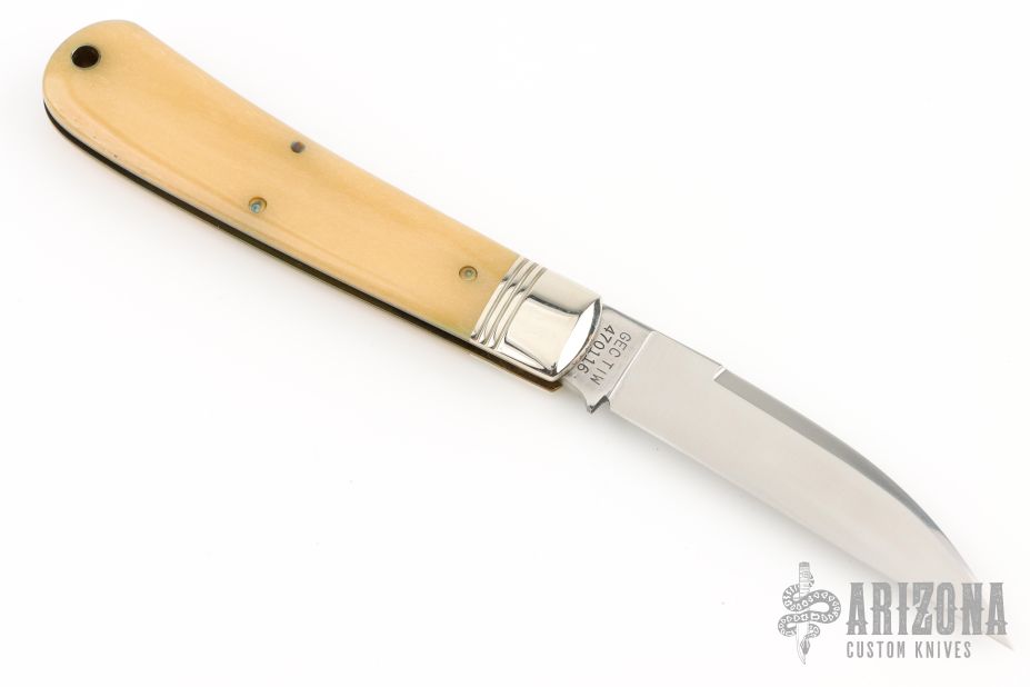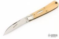 This Viper from Great Eastern Cutlery features a mirror finished wharncliffe style blade with swedge and nail nick. The handle has pinched nickel silver bolsters and escutcheon and smooth oiled bone covers over brass liners and steel backspring. Has Half-stop. Includes the original packaging.  Excellent Condition.