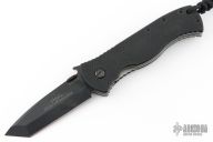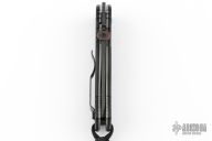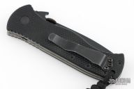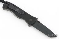 This CQC-7 by Emerson Knives has a black tanto chisel ground blade with notched thumbrest, wave features and a single thumbstud. Has G-10 scales, titanium liners, barrel spacers, and a tip up black stainless clip. S/N 16 of 70. Nice detent, lockup and blade seating. Comes in a padded zipper case. Has some scratches on the clip, excellent condition otherwise. Has copper thumbdisc and bead. Listing does not include the original black knurled thumbdisc.