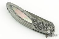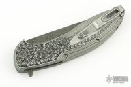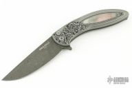 This Cambria flipper by Pro-tech features a Chad Nichols stainless Damascus blade with flipper. The handle has a two-tone stainless steel frame with black lip pearl inlay in the frame and push button, tip up stainless steel clip. The handle has full coverage deluxe leafy scroll engraving by Master Engraver Bruce Shaw. Tons of detail in the engraving all the way around this knife. Rides on bearings, nice detent, lockup and blade seating. Comes with original box and papers. Comes with wooden presentation box with details on top dated May 2017. Excellent condition.