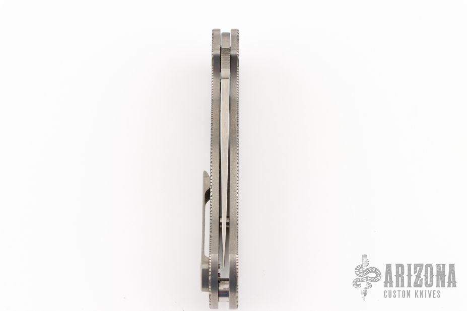 This Paramilitary 2 compression lock folder has a stonewash finished 15V stainless steel clip point blade with thumb hole and notched thumb rest. Handle has custom laser engraved titanium scales, stainless steel liners and custom titanium clip. Comes with original brown G-10 scales, and custom black/yellow G-10 scales. Excellent condition.