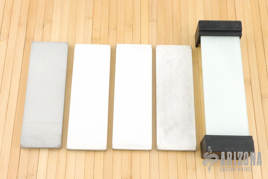 Each stone is backed with 5 millimeters of glass which provides a firm, flat base to adhere the ceramic waterstone abrasives. In addition, the glass backing provides you with a greater utilization of the stone because you can wear it down to the very end. In any other waterstone, as they wear thin, the stone will break and cannot be used.