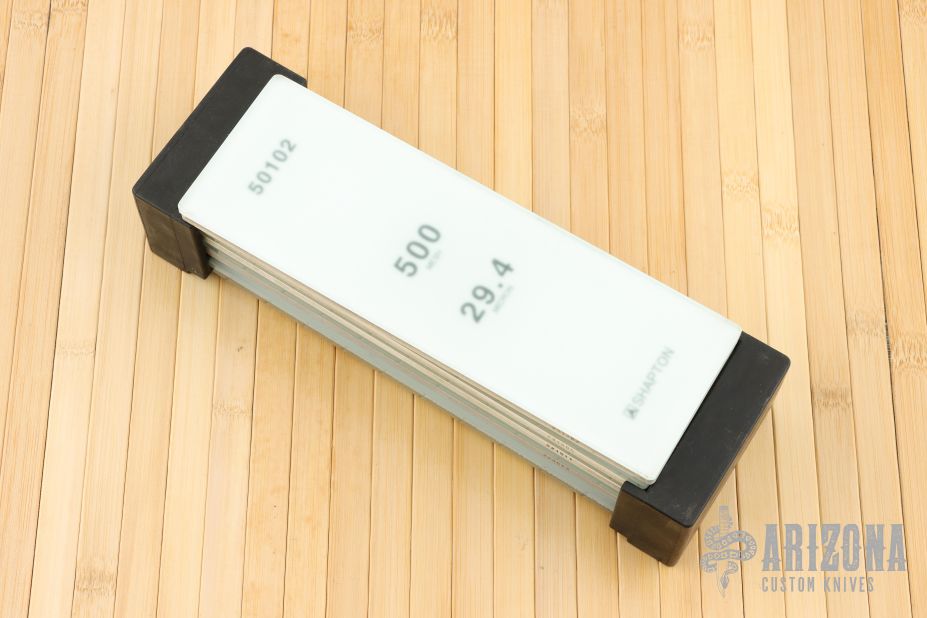 - 500 Grit Shapton GlassStone - this stone is medium coarse and is to be used on dull tools and knives. The grit particles used on this stone are large for medium fast cutting. The grit particle size measure 29.4 micron average.