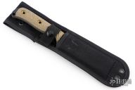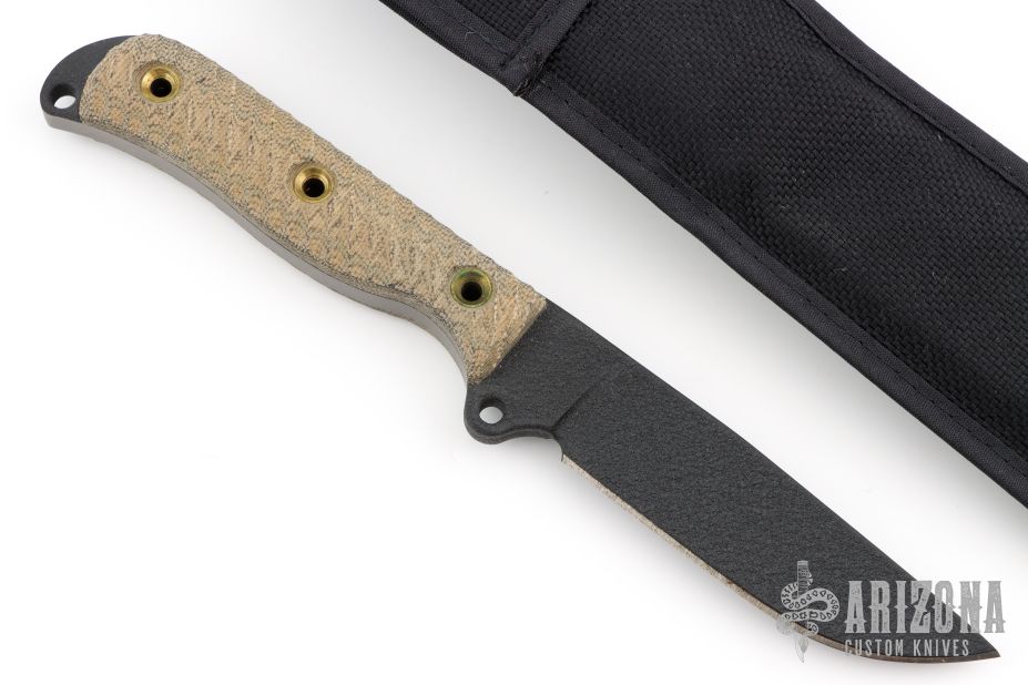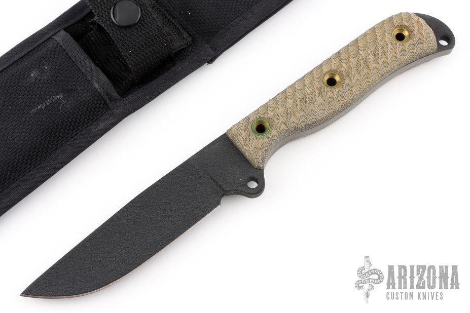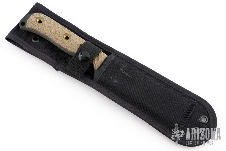 This SHSJ Satin Jack by Busse features a black coated drop point blade, .277" blade stock, 1.115" blade depth, full tang construction with textured micarta scales and a lanyard hole. Comes with a nylon belt sheath. Has some scuffs on the blade. Excellent condition otherwise.