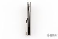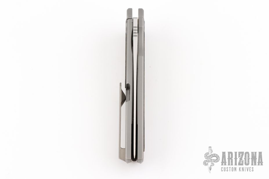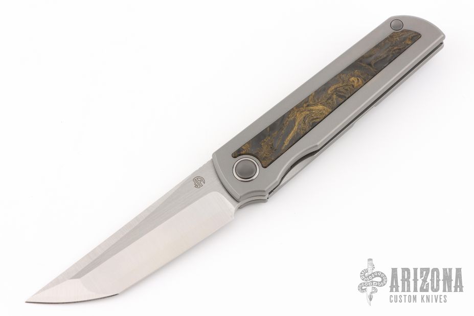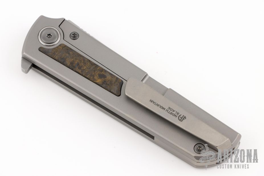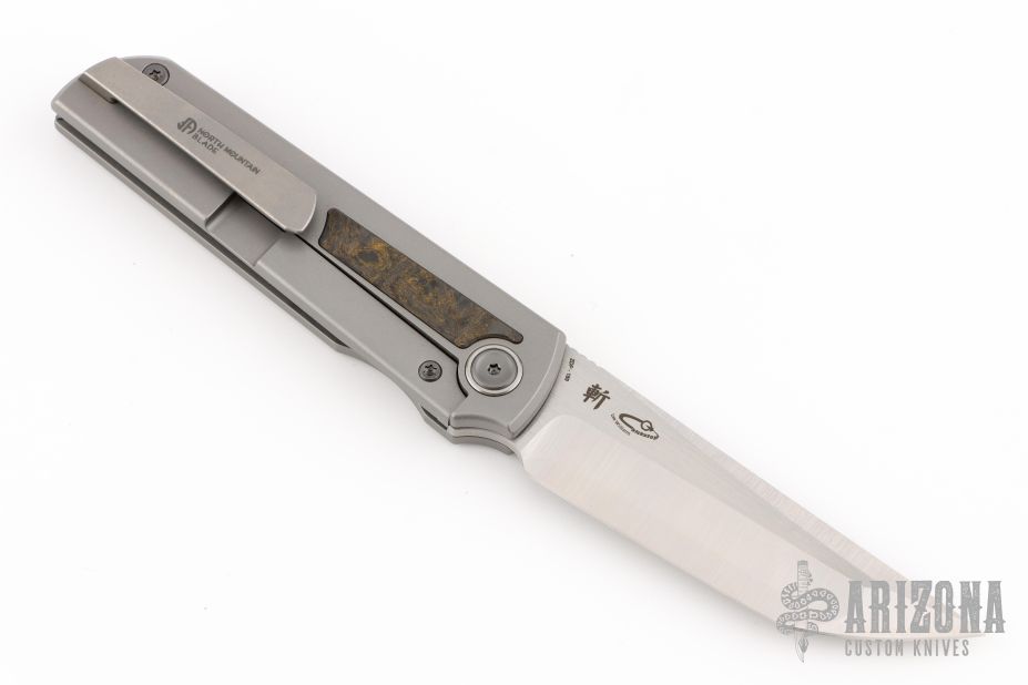 This Chop by North Mountain Blade features a satin finished ZDP-189 core San Mai blade with notched thumbrest and Lee Williams Kickstop flipper. The handle has a bead blasted titanium frame with Dark Matter Carbon Fiber inlay, tip up titanium clip and backspacer. Comes with original box, hard case and COA. New from maker.