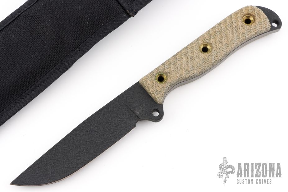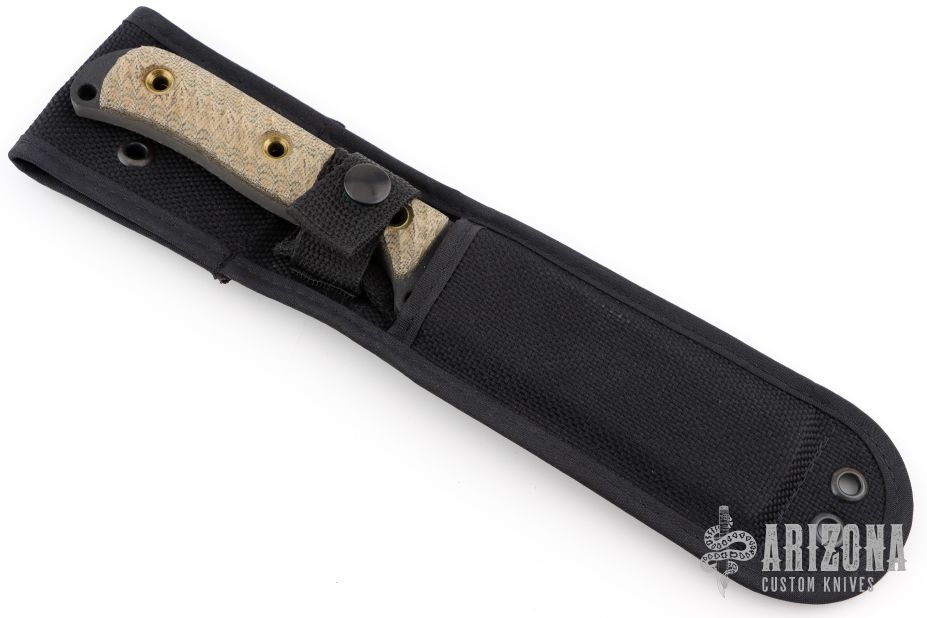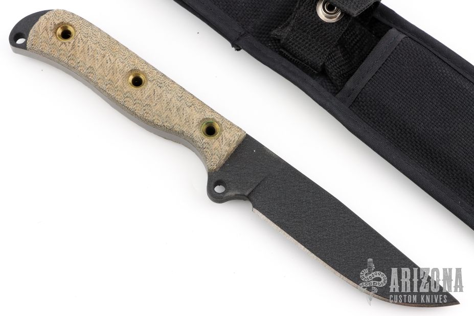 This SHSJ Satin Jack by Busse features a black coated drop point blade, .272" blade stock, 1.201" blade depth, full tang construction with textured micarta scales and a lanyard hole. Comes with a nylon belt sheath. Has some scuffs on the blade. Excellent condition otherwise.
